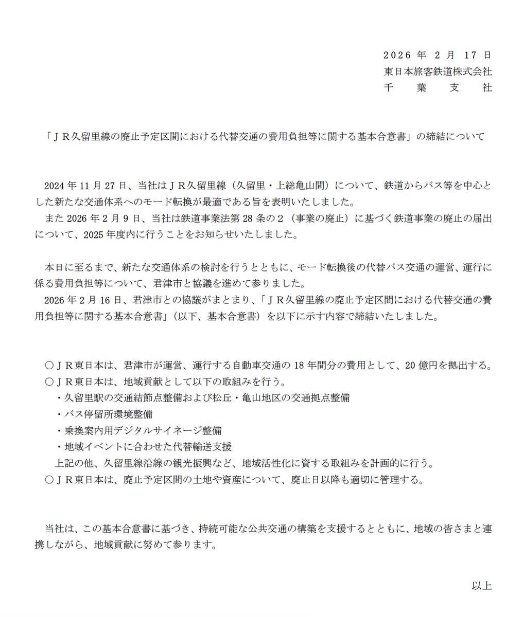 @sankei_train鉄道ファンとしては悲しいニュースですが、バスで高校直通便ができたり便数が増えて地元住民の利便性が向上するなら喜ばしいことですね 一部廃線予定のJR久留里線、代替バスの運行20億円、JRが全額拠出で千葉県君津市と合意 sankei.com/article/202602…