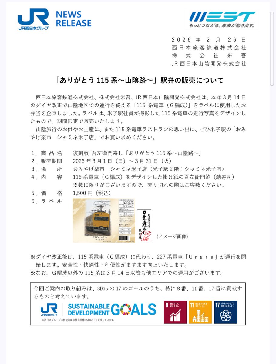 @HitoshiMisaka2JR西日本: 115系 情報 🔽 山陰を走る「食パン列車」引退へ ラストランを記念した駅弁が3月から米子駅で販売 (#乗りものニュース) #Yahooニュース #JR西日本 #115系 #Topics news.yahoo.co.jp/articles/b2916… pic.x.com/jGK4zoGLIH