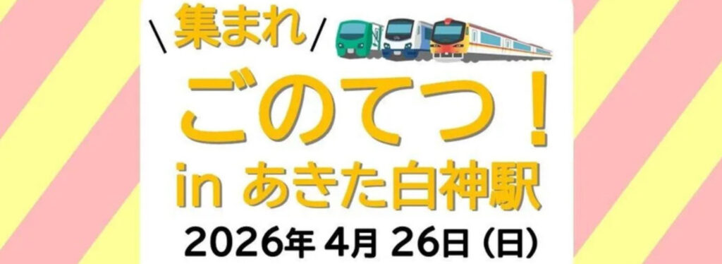 NEW! JR東日本(鉄道ニュース速報 東日本) お宝販売??4/26開催!当日受付の抽選販売??駅名看板や乗車口案内板もアリ〼?? 2026年4月19日 JR東日本秋田支社は26日、五能線あきた白神駅で鉄道ファン向けイベントを開催します。駅名看板などの鉄道古物販売(抽選制)や、子ども向けの駅長制服体験、ぬり絵・工作、保線機械の展示などを実施します。大人から子どもまで楽しめる内容で、昨年はクマ出没で中止となったイベントの再開催となります。 <関連する記事> 五能線のお宝... あいえす