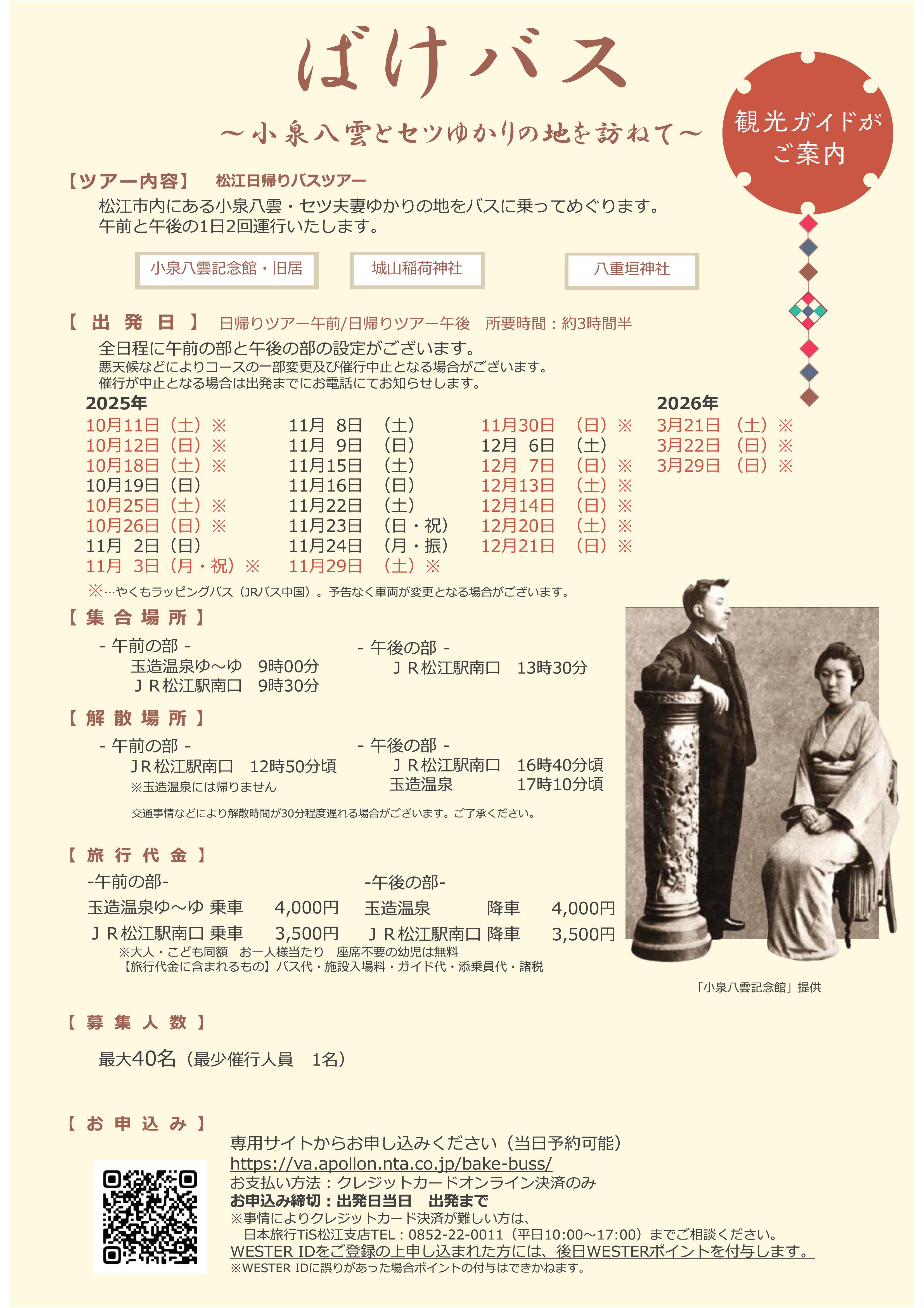 @ai_news_x【ニュース】朝ドラ「ばけばけ」放送機に注目!JR西日本が小泉八雲ゆかりの地を巡る「ばけバス」ツアーを10/11から開始します。 ✅ポイント ・松江市内の八雲旧居、城山稲荷神社、八重垣神社などを観光ガイドの案内付きで巡る約4時間のコース。