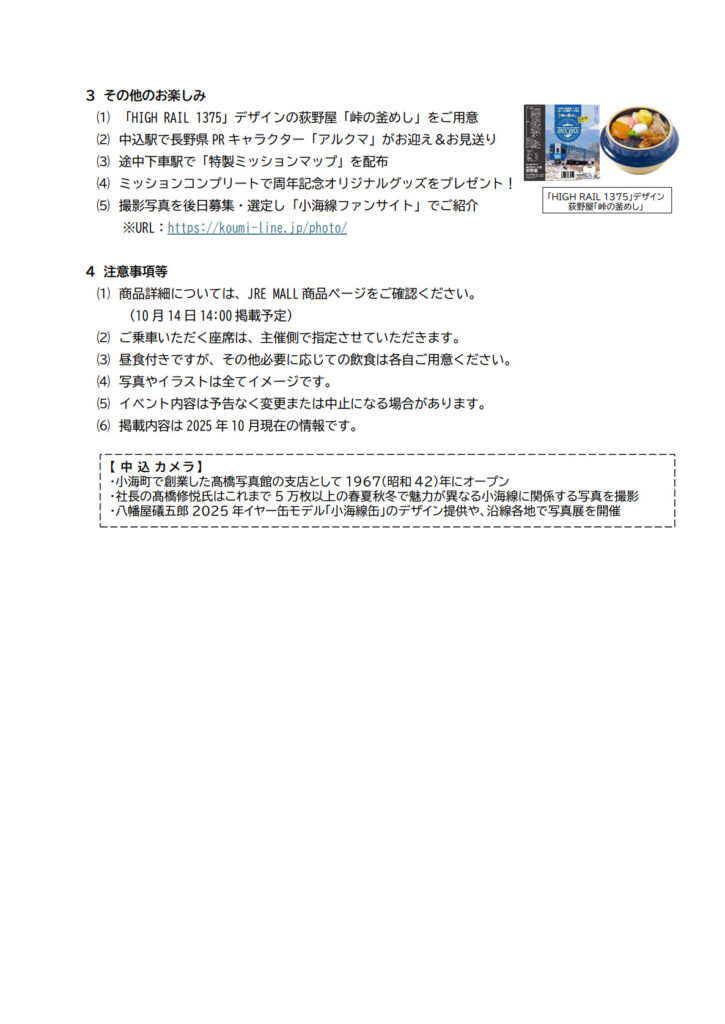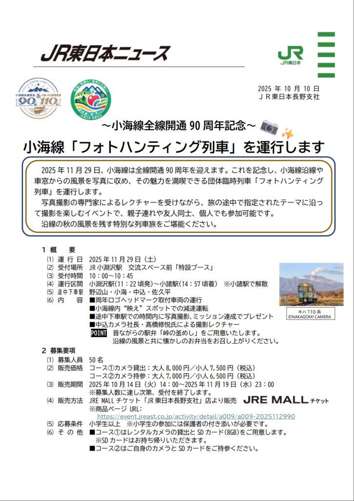@mikawa_1964「途中駅で下車し、テーマに従って写真撮影を楽しむ他、『撮影スポット』での減速運転がある」jreast.co.jp/press/2025/nag… / 小海線90周年を記念、臨時の「フォトハンティング列車」を11月29日運行 10月14日にチケット発売|信濃毎日新聞デジタル htn.to/39yBiQyUza