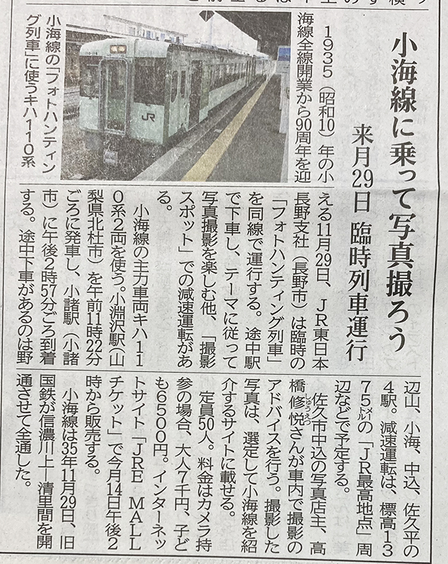 @naonao0911小海線90周年を記念、臨時の「フォトハンティング列車」を11月29日運行 10月14日にチケット発売|信濃毎日新聞デジタル 信州・長野県のニュースサイト shinmai.co.jp/news/article/C…