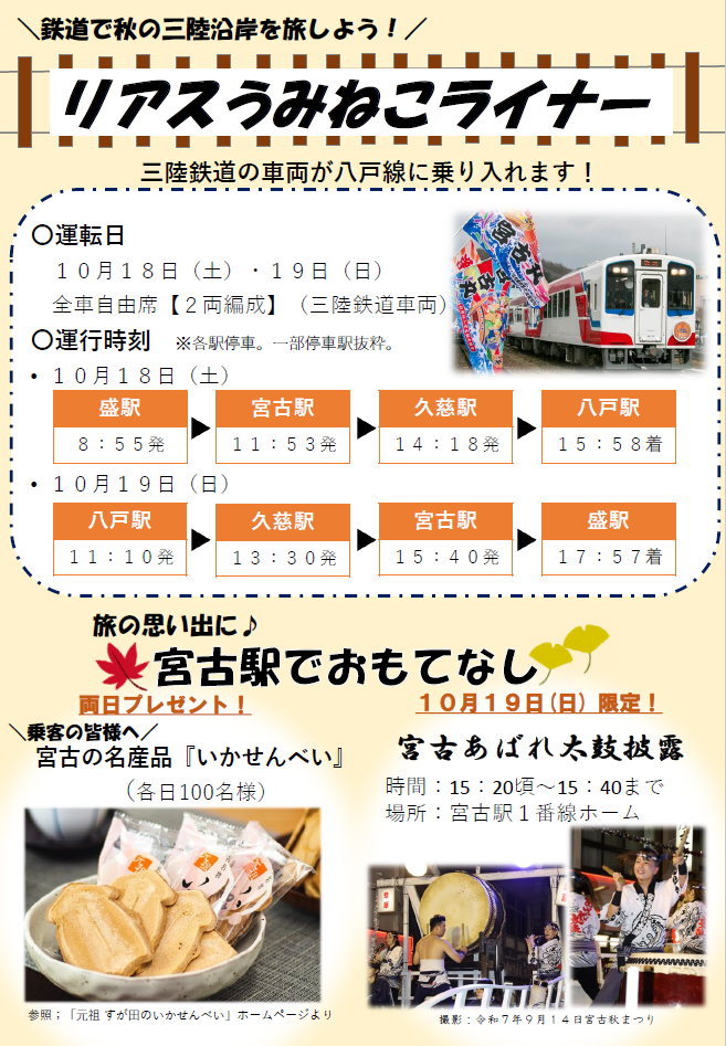@AOI_pawn今日の北三陸から。 三陸鉄道「リアスうみねこライナー」が八戸から盛まで運行。 海沿いを走る列車に、秋の光が揺れている。 ▶︎ ソース: [三陸鉄道公式](railfromokayama2.com/2025/10/16/san…) #北三陸ニュース