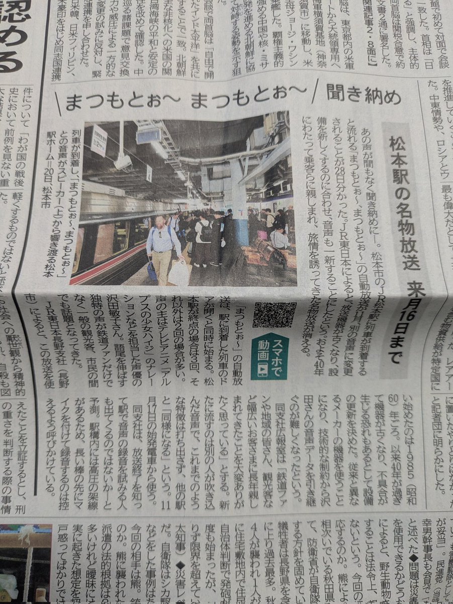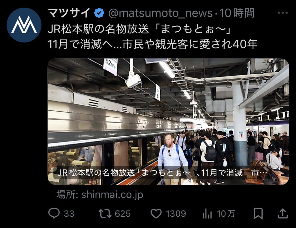 @tdr370新しく更新されたアナウンス音声が日髙のり子の声で 「まつもとぉー まつもとぉー」も受け継いでいたら ある意味胸アツかもしれんが(それはないよね(´;ω;`)ウゥゥ)。 x.com/matsumoto_news…