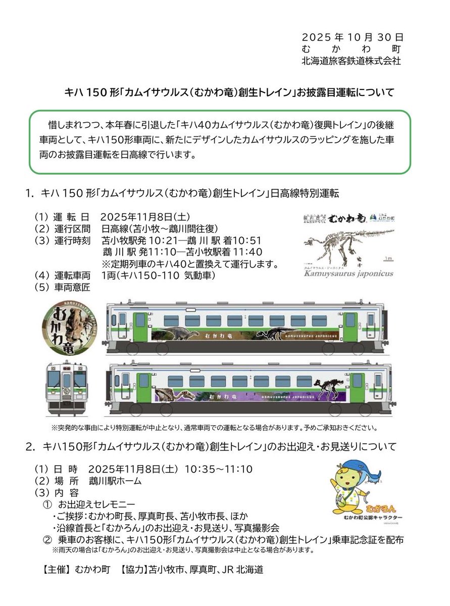@JHR_Tomakomai新ラッピング車両「カムイサウルス(むかわ竜)創生トレイン」11月8日デビュー JR日高線 苫小牧~鵡川間(HTB北海道ニュース) news.yahoo.co.jp/articles/cd266…