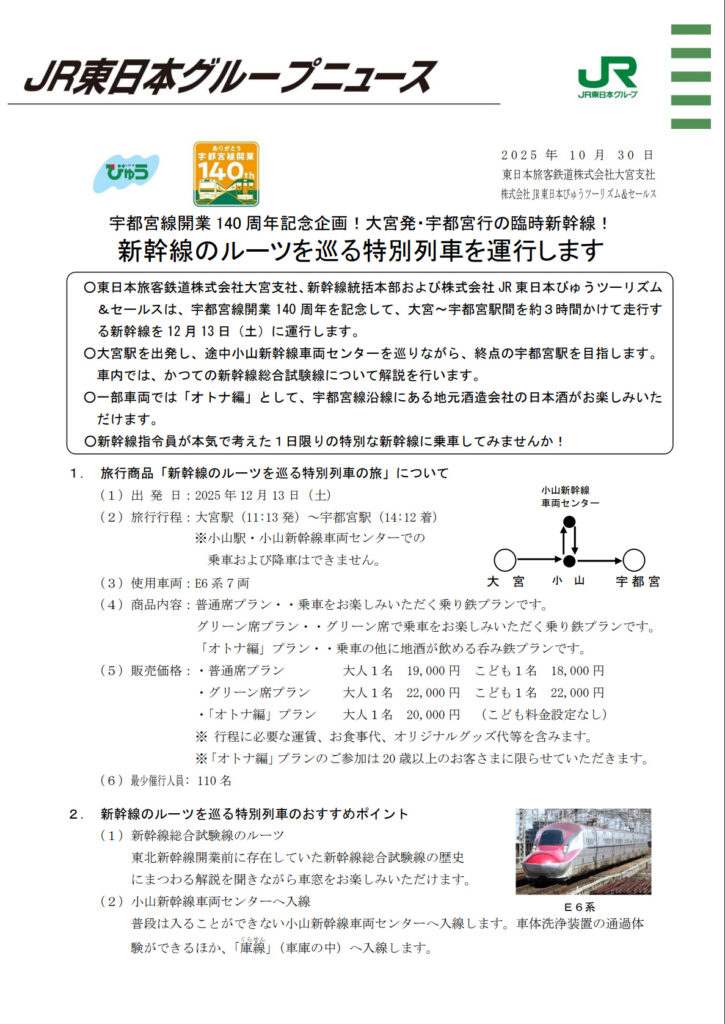 @etsumi_sato『通常は秋田新幹線「こまち」で使用されるE6系で運行予定です。大宮駅を出発し、小山新幹線車両センターを巡りながら、終点の宇都宮駅を目指す変わったルートで』 大宮→宇都宮を「3時間かけて走る新幹線」が運行へ 通常なら30分弱の区間を遠回り! 在来線でも約1時間20分 news.yahoo.co.jp/articles/21c4f…