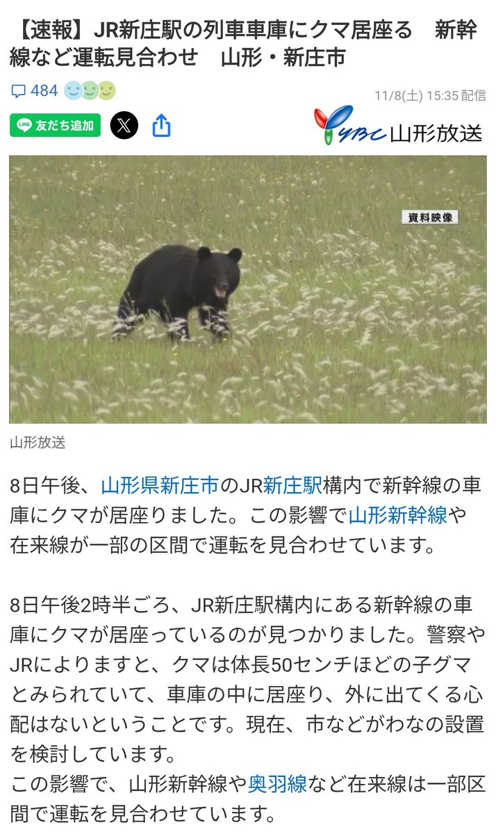 @hanakiyokozuきょうも相次ぐ“熊被害”…山形・JR新庄駅車庫に熊“居座り”山形新幹線1本が区間運休に 福井では工場“居座り熊”を緊急銃猟で駆除 #FNNプライムオンライン fnn.jp/articles/-/957…