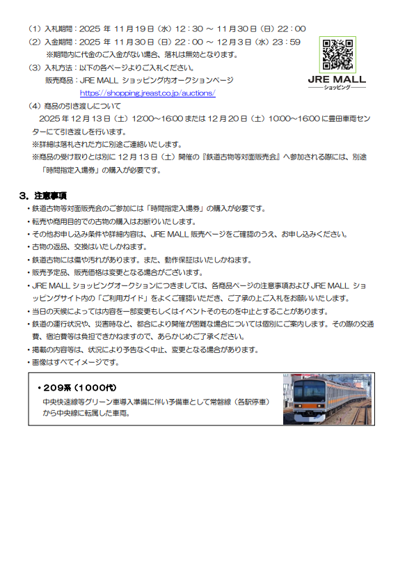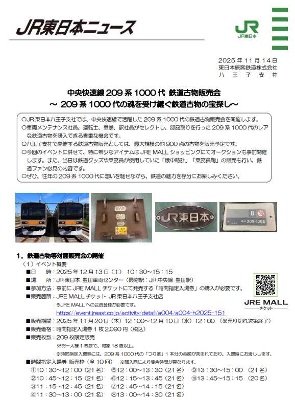 @Green_kaisoku209系1000番代で使用されていた鉄道部品の販売会を12月14日に実施。販売会参加には時間指定入場券が必要 一部の部品はネットオークション形式で販売 中央快速線209系1000代 鉄道古物販売会 ~ 209系1000代の魂を受け継ぐ鉄道古物の宝探し~ jreast.co.jp/press/2025/hac… pic.x.com/2dhfwFacNg