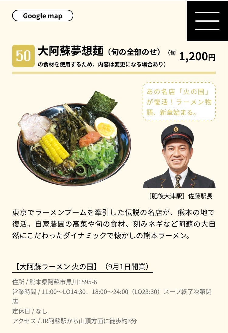 ラーメン激戦区ともいわれる、東京都町田市で"伝説"と言われたラーメン店を30年経営した経営者が行き着いたラーメンが、母の味の昔ながらの熊本ラーメンでした。そんなラーメンを阿蘇駅から徒歩6分の大阿蘇ラーメン火の国食べることができます。ラーメンを食べることが、ただの食事を超えて、家族や思い出を感じさせてくれるのは、料理の持つ力ですね。