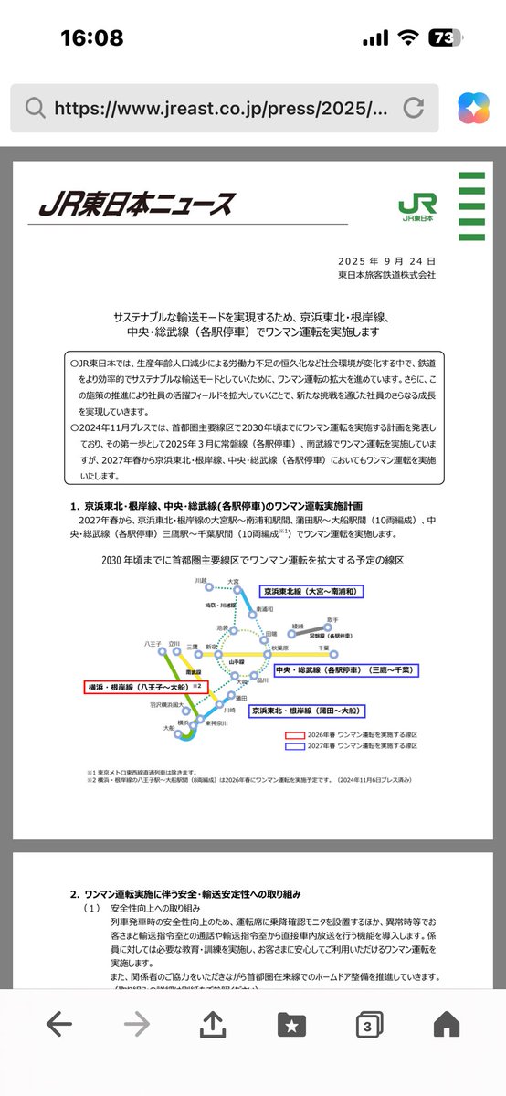 @ZIPANGUinSSA「京浜東北線」が2027年春から「ワンマン運転」へ。将来のオペレーションコスト削減は390億円に!? 「鉄道車掌」の年収も紹介(ファイナンシャルフィールド) news.yahoo.co.jp/articles/09d75… 首都圏の路線はどんどんワンマンになってくなぁ