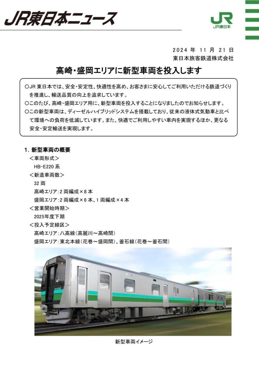 新型車両「HB-E220系」がいよいよ釜石線でデビューします。この新車両は、最新の技術を取り入れた環境に優しいデザインが特徴で、多くの乗客に快適な旅を提供することでしょう。デビューを心待ちにしている方も多いはず。実際に乗ってみて、その快適さを体験してみたいですね。
