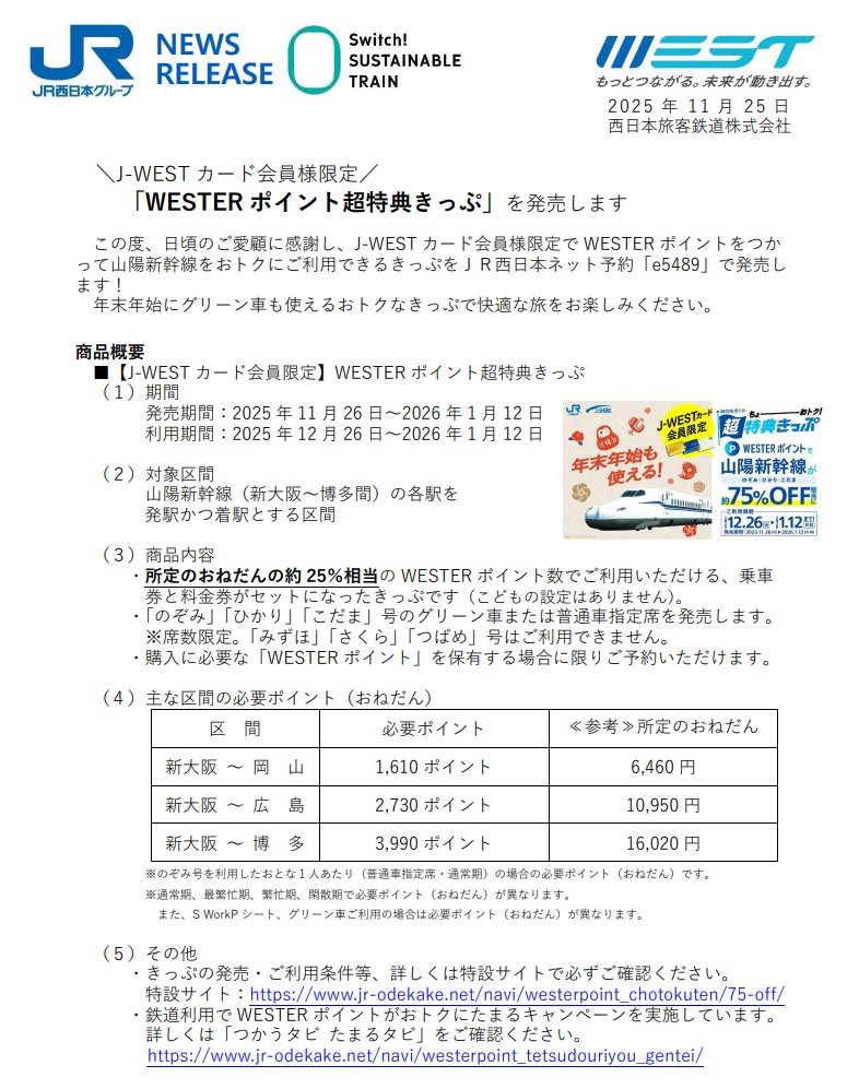 @akashijournalJ-WESTカード会員限定「WESTERポイント超特典きっぷ」が11月26日から販売スタート!12月26日~1月12日の期間の新幹線が実質75%オフ akashi-journal.com/outing/wester-…