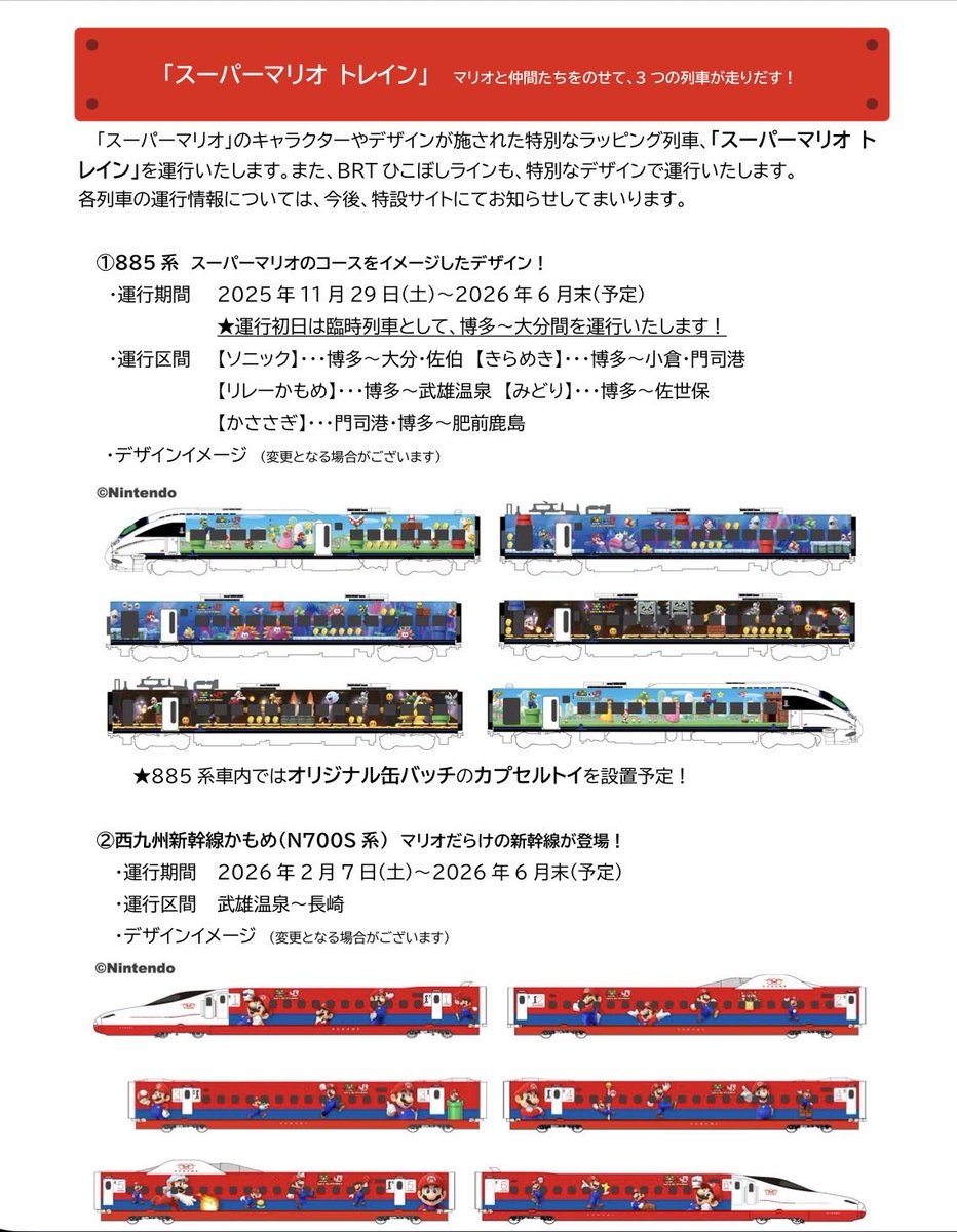 @kbrkohrki2『スーパーマリオトレインは2026年1月にも大分と宮崎の間で運行される予定です。』 「スーパーマリオトレイン」大分駅に到着 人気ゲームスーパーマリオとJR九州がコラボ |TOS NEWS NNN news.ntv.co.jp/n/tos/category…
