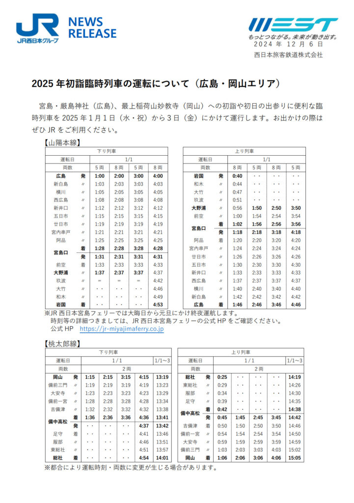 @chatoran5深夜・早朝も初詣可能に…最上稲荷・厳島神社(広島)初詣の臨時列車運行を発表 JR西日本(岡山放送) u.lin.ee/A8v1RgF?mediad…
