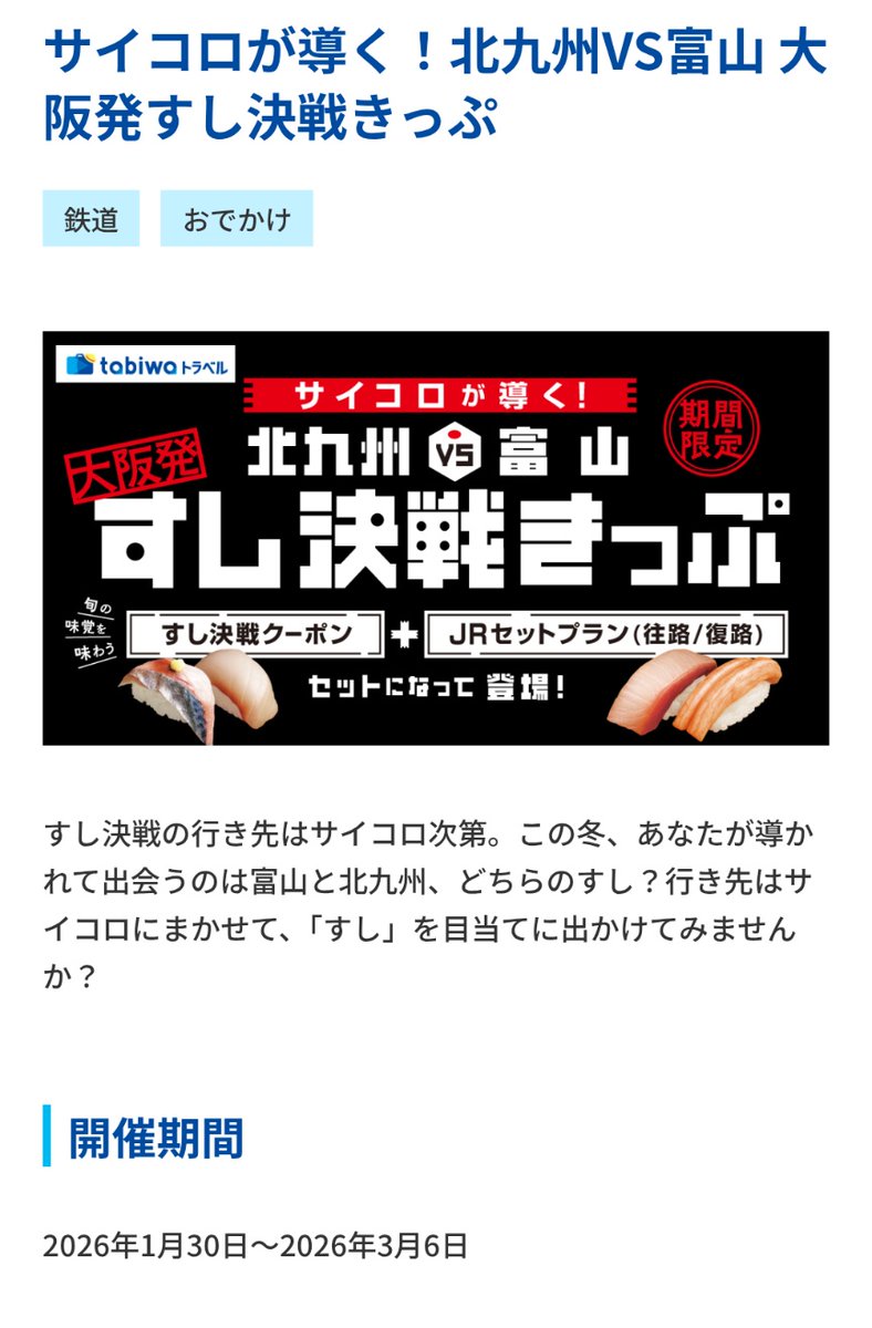 @47news_officialさいころ振って「すし鉄」 JR西の新旅行商品 大阪発で富山か北九州、お得に 47news.jp/13620656.html
