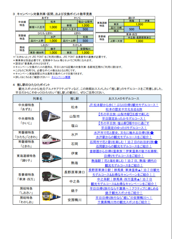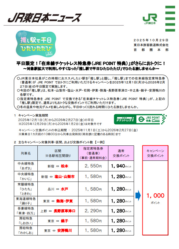 @sstgtosinJR東日本の「推し駅で平日ひたひたたび」2025年12月01日(月)〜2026年02月27日(金)期間の平日、特急「あずさ」 新宿・立川・八王子 ⇔ 松本のチケットレス特急券がJREポイント1,000pで交換できるjrepoint.jp/campaign/00610…
