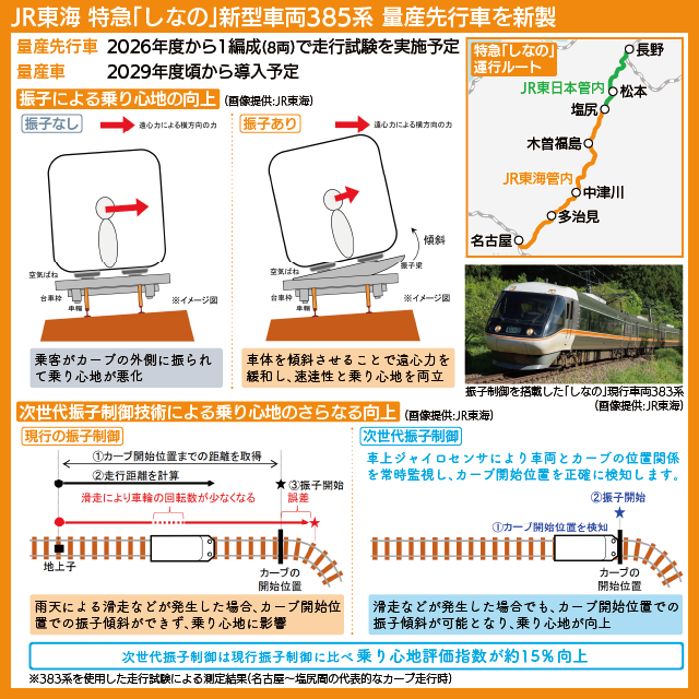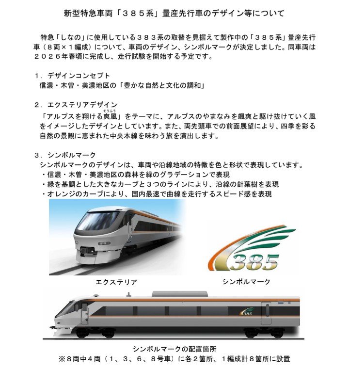 @Cyobinosuke1stJR東海は12月23日、新型特急形車両「385系」の量産先行車(8両1編成)の車両のデザイン、シンボルマークが決定したと発表した。 新型「特急しなの」デザイン決定! グリーン座席に“初の構造”採用 全席コンセント 「国内最速で曲線を走行」する韋駄天に! | 乗りものニュース trafficnews.jp/post/619241