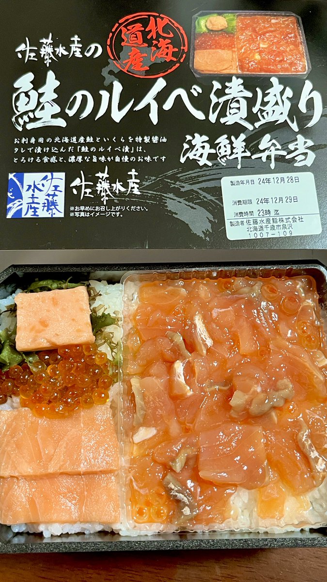 @HAL9500twit佐藤水産の鮭のルイベ漬盛り海鮮弁当、ご飯が硬い以外はめちゃくちゃ美味しかった。