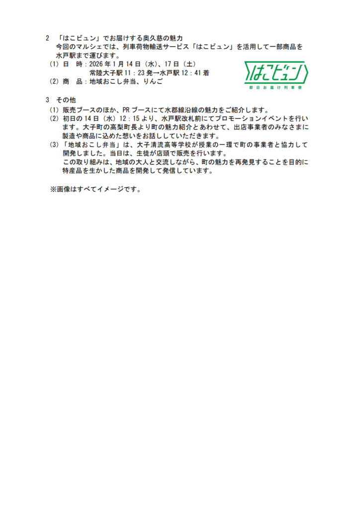 @daigo_town【水戸駅に大子の旨いが大集合!🍎】 1/17(土)までJR水戸駅改札前で 「けんしんエキナカ奥久慈マルシェ」を開催中! 大子清流高校の生徒考案「地域おこし弁当」や奥久慈りんご、地元名産品が勢揃い✨(※日によって出店内容が異なります) 水戸駅ご利用の際は、ぜひお立ち寄りください🙏 #大子町 pic.x.com/RlWpDoBPIq
