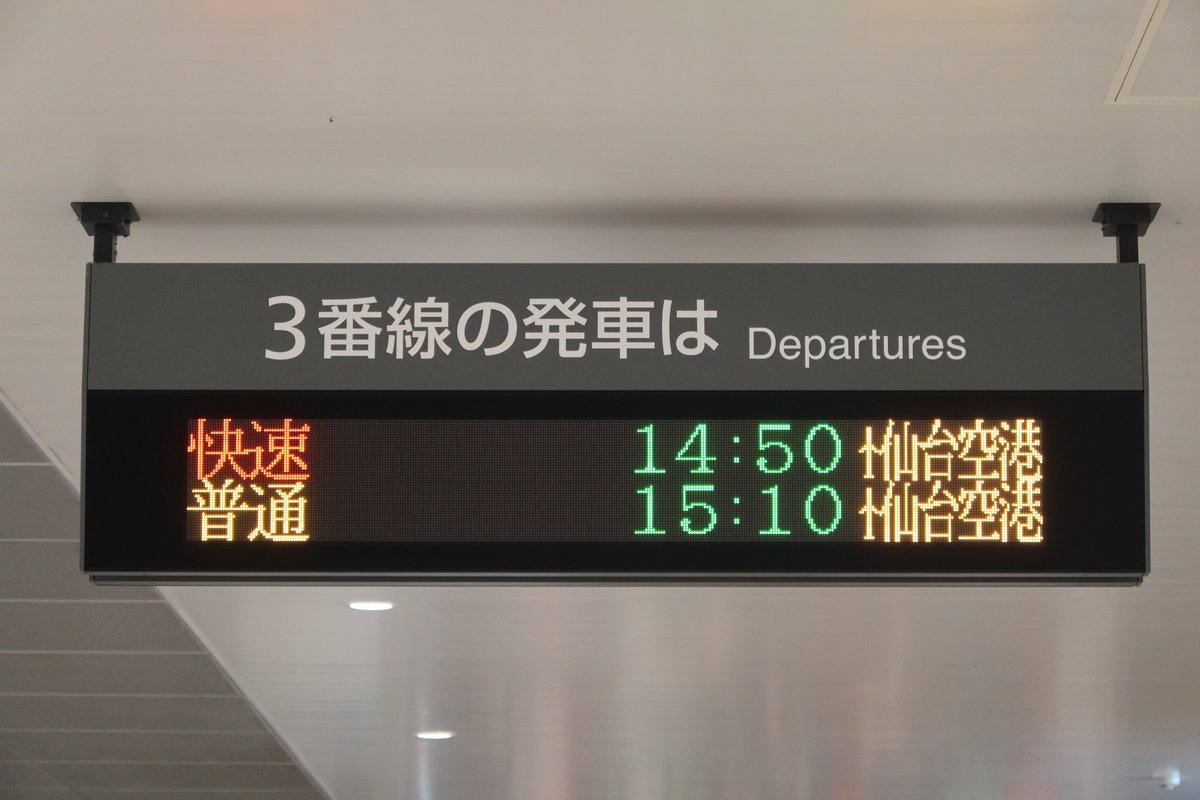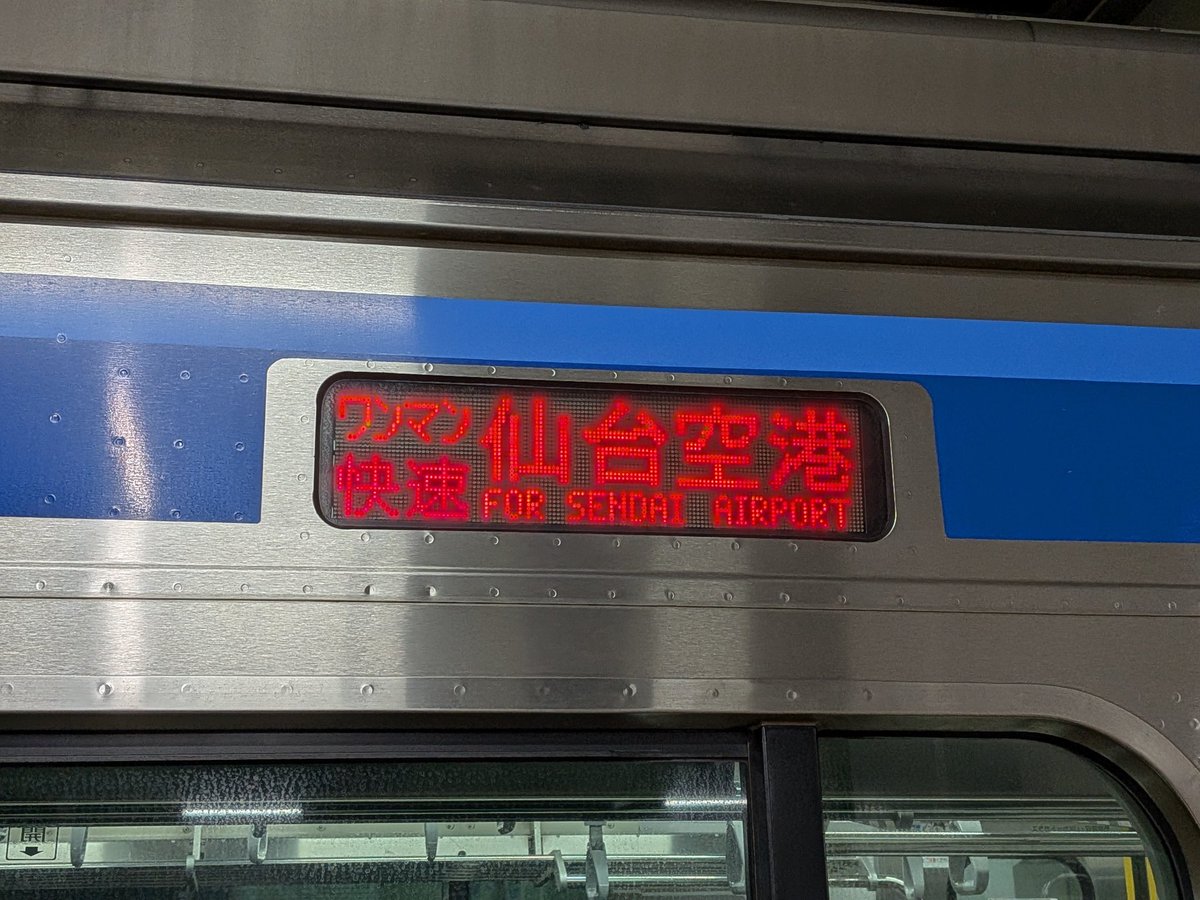 @EH500_1_Freight返信先:@GQdfCU0SSb1987 仙台空港アクセス線というその名の通り仙台空港へ行ける路線があり、ここは快速列車が1日一往復のみ仙台〜仙台空港で運行されてるんですが、来年の3/14のダイヤ改正で快速が廃止されます だから通過運転も快速幕も消滅します