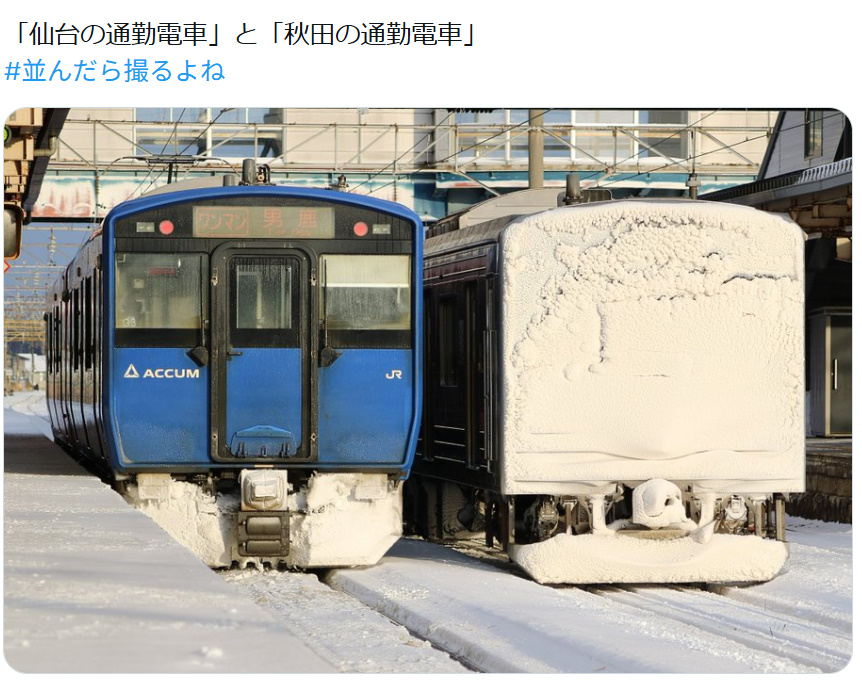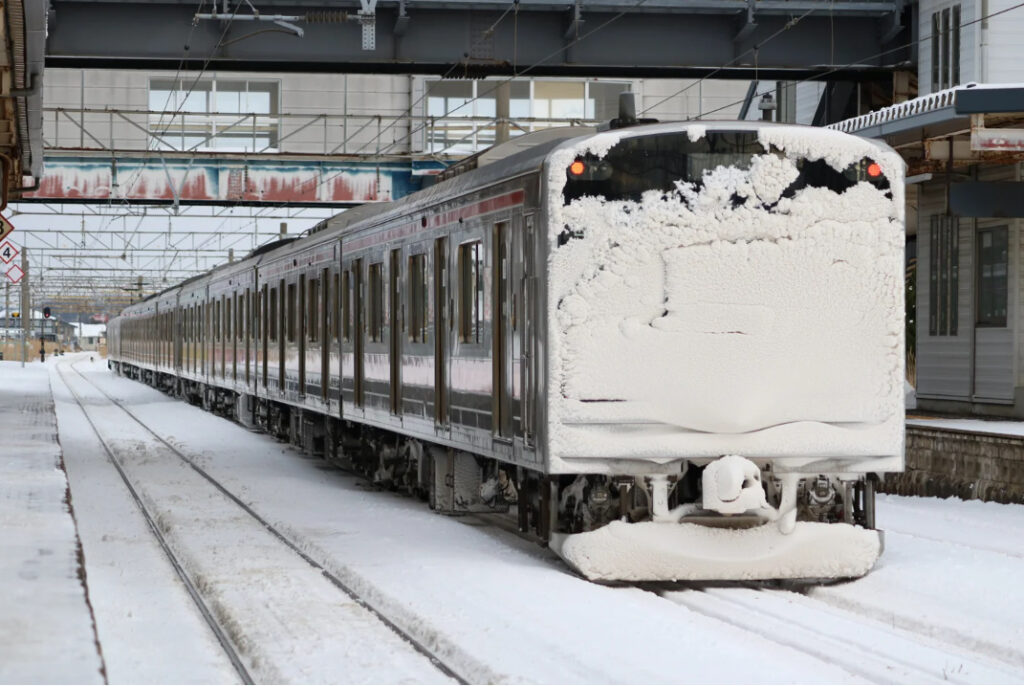 秋田の電車が雪に覆われ、「原型がわからない白」に。ユニークな体験を通じて、"食パンマン"や"雪顔パック"と称される反響が話題に。