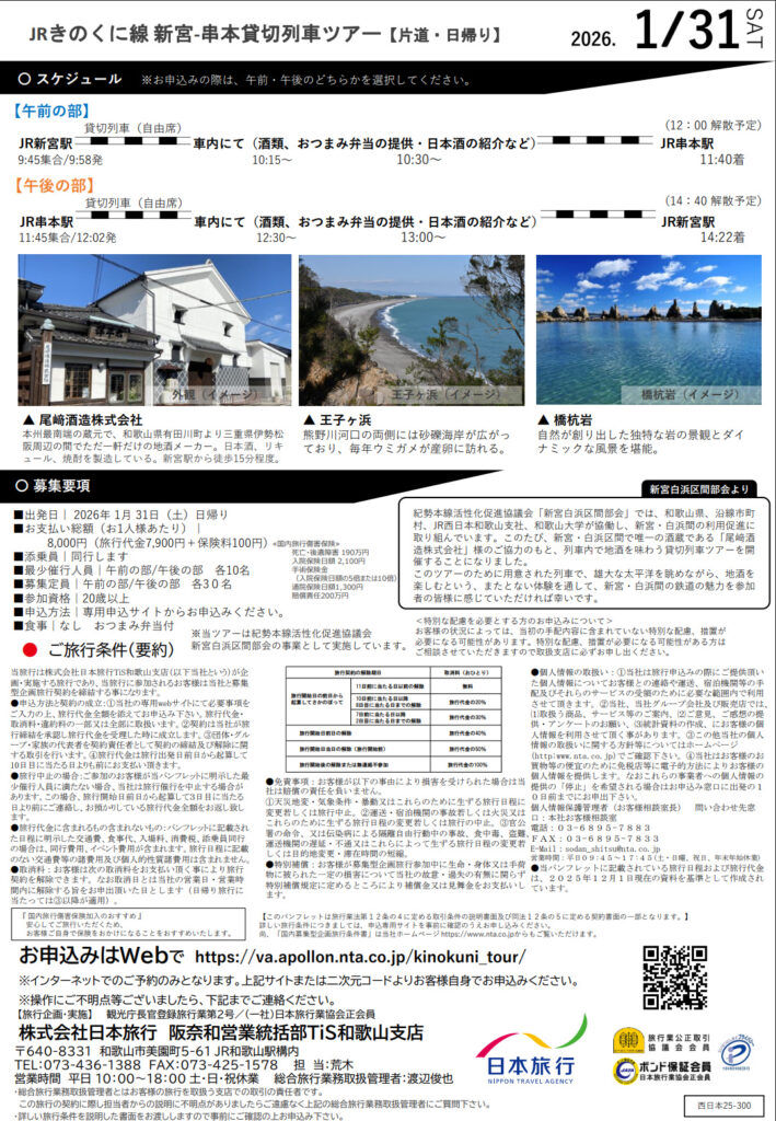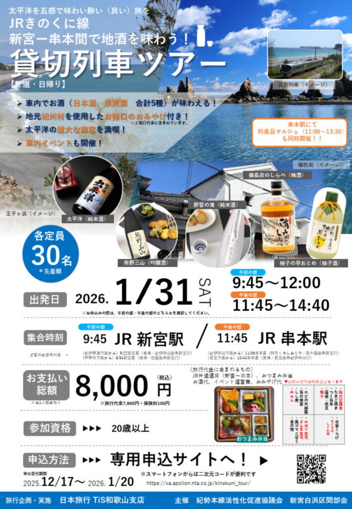 日本酒列車は、JR紀勢線の新宮と串本を結ぶ新しい観光プランです。美しい自然景観を楽しみながら、地元の日本酒を味わえるのが魅力。旅行者にとって、日常の喧騒を忘れさせてくれる特別な体験になるでしょう。和歌山の新しい観光名所として、多くの人々に利用されることを期待しています。
