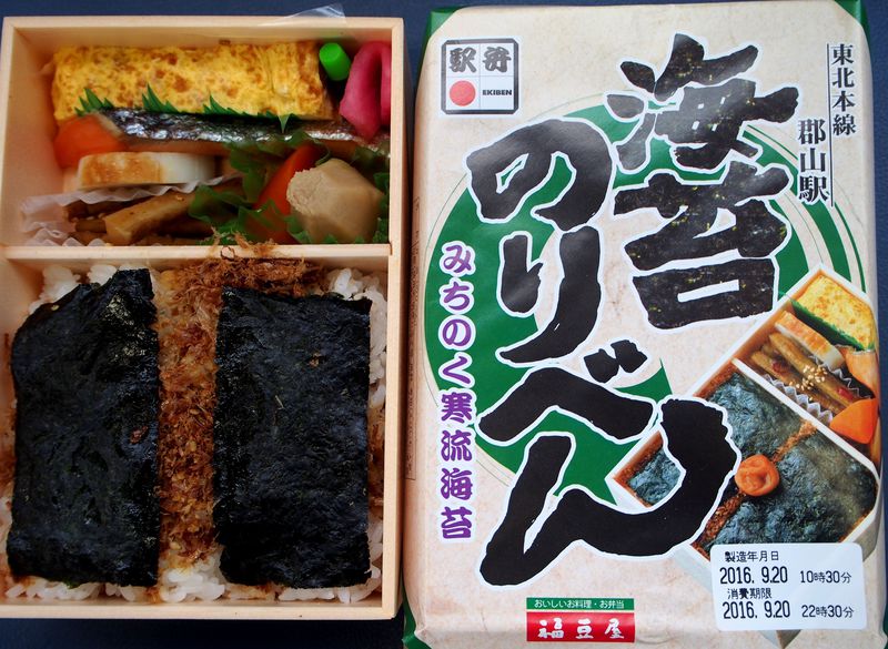 @kadoya1郡山駅で購入した福豆屋の「海苔のりべん」 駅弁でのり弁かよと思って期待していなかったけど今まで食べたのり弁で一番美味しかった。海苔と鰹節の塩梅が丁度よくて箸が止まらない。おかずもご飯にあう物ばかり。豪華さはないけど確実に美味しい駅弁だ。 pic.x.com/96EpjoUKzs
