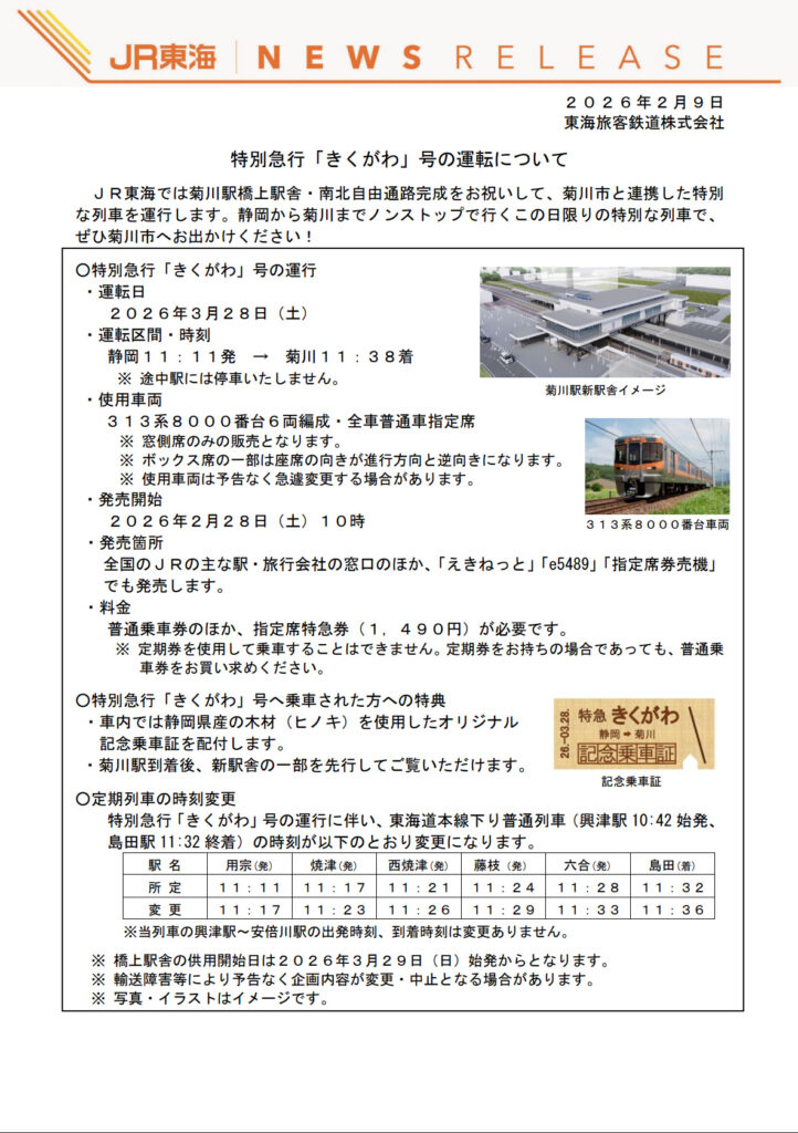 @HitoshiMisaka2JR東海: 臨時列車 運行情報 🔽 東海道本線で「普通列車用の電車」による「臨時特急」登場! 「きくがわ号」3月28日に運転 (#鉄道コム) #Yahooニュース #JR東海 #313系 #東海道本線 #Information news.yahoo.co.jp/articles/9a451… pic.x.com/mOyEK982Kz