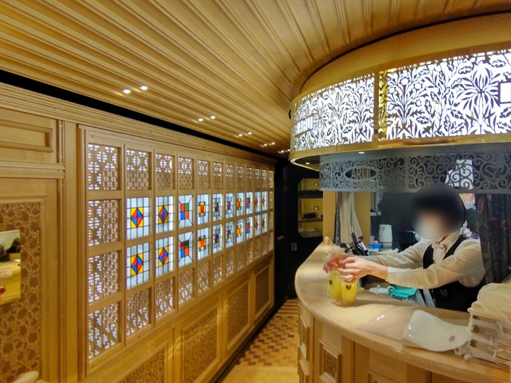 @Polaris_88或る列車を使った或るカフェ、キンキラキン✨の車内をじっくり見学出来ました☺️ トイレも豪華絢爛😳 pic.x.com/qUoAru2ze3
