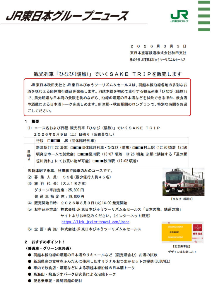 羽越本線に「ひなび」が初入線。新津から秋田までの旅で、地元の名酒と美しい海景色を楽しむ特別列車に期待が寄せられています。