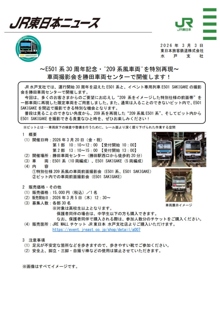 これまで多くの鉄道ファンに愛されてきたE501系の30周年、そして209系の前面帯の再現。まさに鉄道の歴史を感じさせるイベントです。参加することで、昔の記憶が蘇り、ファン同士の交流にも盛り上がること間違いなし!この素晴らしい機会をお見逃しなく。
