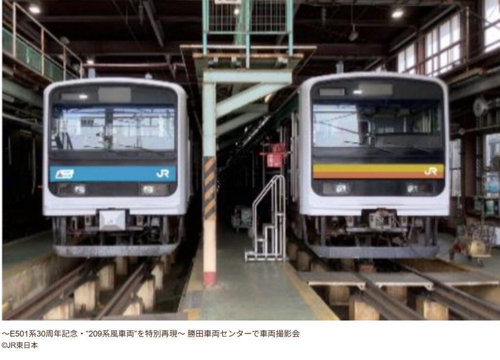 @Kozaki_nigu~E501系30周年記念・“209系風車両”を特別再現~勝田車両センターで車両撮影会(JR東日本 水戸支社) | JR東日本が運営【JRE MALLチケット】 見た目が瓜二つだから209系っぽく仕立てるの強引で笑ったw 千葉の209系も京浜東北線時代を再現したら人気でる?? event.jreast.co.jp/activity/detai…