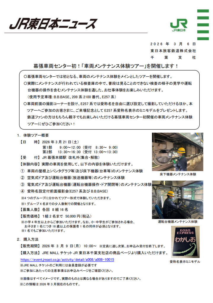 @programming_inf【春休み2026】JR幕張車両センター「車両メンテナンス体験ツアー」3/21 - リセマム ift.tt/Q0gk1wn