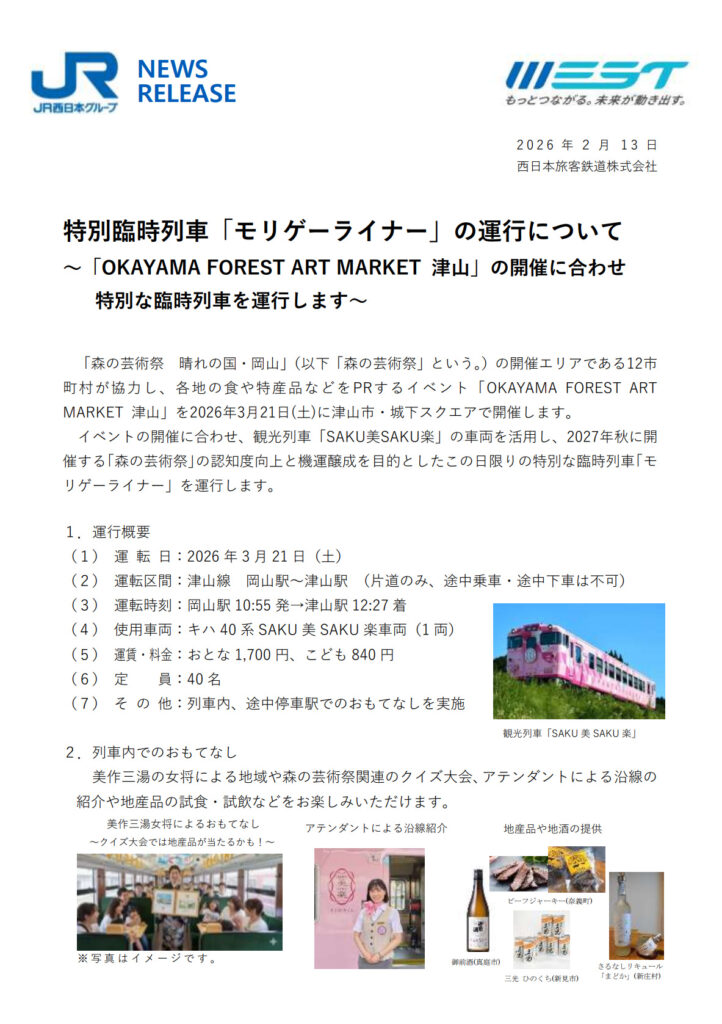 @Okayama_JR「OKAYAMA FOREST ART MARKET 津山」や「モリゲーライナー」の詳細は画像のチラシや下記リンクよりご確認ください。 westjr.co.jp/press/article/…