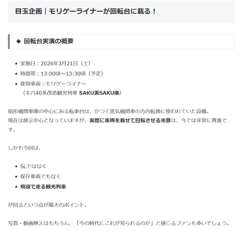 @kisekiswrfSAKU美SAKU楽 モリゲーライナー 運転(2026年3月21日) - 鉄道コム tetsudo.com/event/58970/