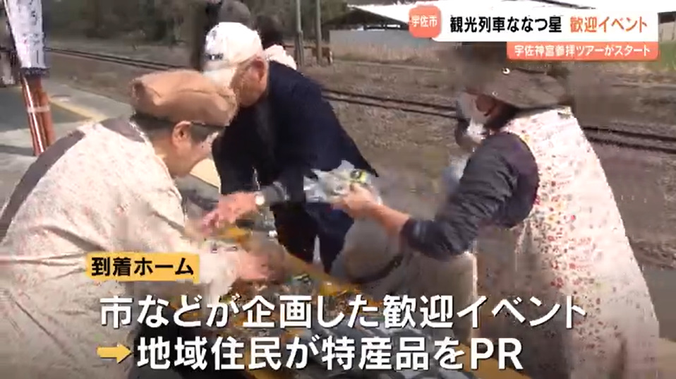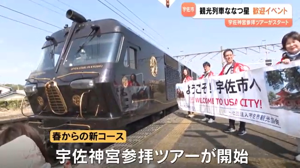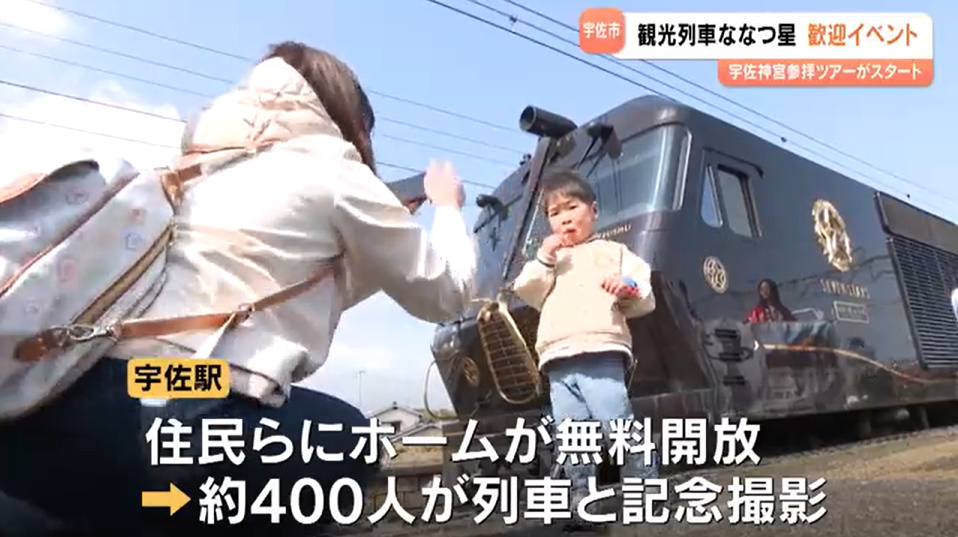 JR九州の観光列車「ななつ星in九州」が新ルート運行を開始し、宇佐駅で歓迎イベントが開催されました。約400人の住民が出迎え、特産品PRや子ども向けワークショップも実施されました。列車は約2時間停車後、別府方面へ出発しました。新コースは6月まで運行予定です。