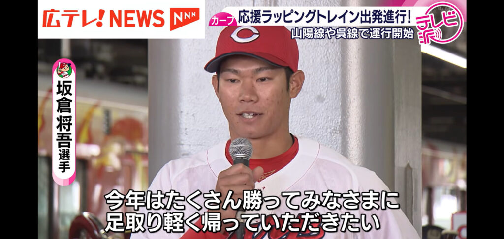 @9iVNcqqWXxXJg6T今年の🎏カープ応援ラッピングトレイン🚉がお披露目されました☝🤓🎶 この🚉に乗って🏟応援に行きたいなぁ〜🤭💖 坂倉選手のコメントもナイスでーす✌🤩💯 pic.x.com/oI4DQFj0bP