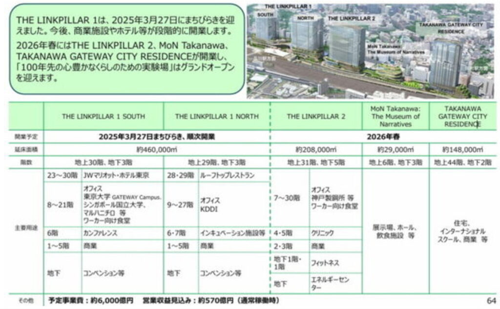 高輪ゲートウェイシティは、高輪ゲートウェイ駅直結の大規模複合開発として、2026年3月28日に本格稼働を開始しました。約20年の構想を経て整備され、商業・文化・住宅などが集まる全長約1.3km、延床面積約84.5万㎡の巨大都市空間となります。新たに複合施設や文化施設、住宅棟が開業し、昼間人口約10万人規模の街を形成します。また、明治期の鉄道遺構「高輪築堤」の展示やトレインビュースポットなども整備され、文化・観光機能も強化します。これにより駅利用者も増加していて、今後の発展が期待されています。
