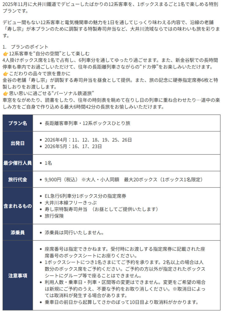 大井川鐵道は、12系客車の4人掛けボックス席を1人で利用できる特別プラン「長距離客車列車・12系ボックスひとり旅」を発売します。対象の6列車に乗車し、寿司弁当や記念品付きで、4〜5月の特定日に実施、料金は9900円です。