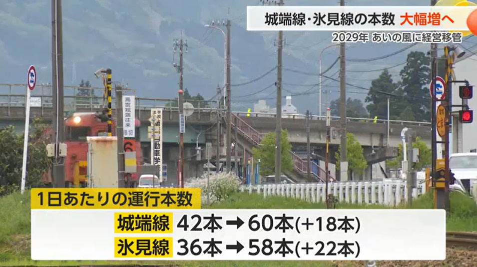 @hokuriku_info2029年あいの風鉄道に移管の城端線・氷見線 運行本数"大幅増" へ パターンダイヤ導入も(富山テレビ) #Yahooニュース news.yahoo.co.jp/articles/48673… >JR西日本によると、1日あたりの運行本数は、城端線は現在の42本から60本に、氷見線は36本から58本に増やす方針です。