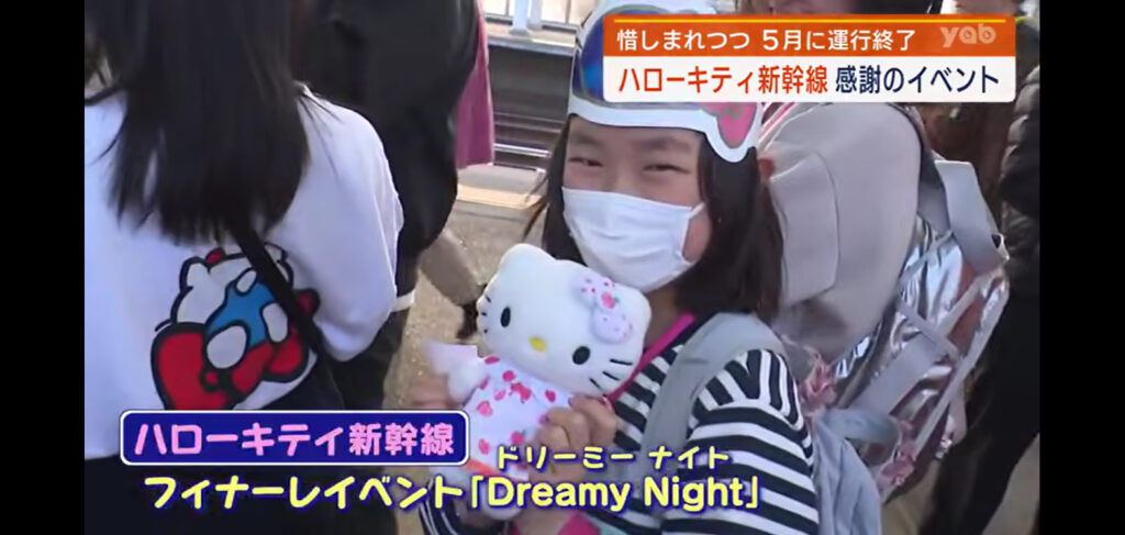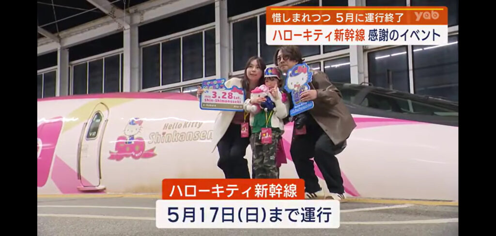 新幹線(鉄道コラム) 東海道・山陽・九州・西九州・四国・リニア(新幹線 鉄道コラム) 鉄道コラム(JR・第三セクター) ドリーミーナイト??間もなく運行終了のアニメキャラ新幹線車両の記念イベント?? 2026年3月31日 2026年3月31日 あいえす Facebook postはてブLINEPocket JR西日本とハローキティがコラボした「ハローキティ新幹線」は、2026年5月で運行終了予定です。これを前に新下関駅で3/28にドリーミーナイトというイベントが開かれ、約100人のファンが参加し、音楽や記念撮影を楽しみました。ハローキティ新幹線の運行は5月17日までです。 <関連する記事> 【山口】山陽新幹線を走る“ハローキティ新幹線” 5月の運行終了を前に記念イベント賑わう(yab山口朝日放送) - Yahoo!ニュース (出典:Yahoo!ニュース) ハローキティ新幹線ありがとう新下関駅でフィナーレイベントにぎわう 5月運行終了 - 47NEWS (出典:47NEWS) <関連する画像> (出典:https://news.yahoo.co.jp/) (出典 2nd-train.net) (出典 i.ytimg.com) (出典 stat.ameba.jp) (出典 stat.ameba.jp) <関連する動画> [Yamaguchi] The "Hello Kitty Shinkansen" running on the Sanyo Shinkansen line is enjoying a livel... (出典 Youtube) <X(旧ツイッター)の反応> 下関ナビ @shimonosekinavi 【山口】山陽新幹線を走る“ハローキティ新幹線” 5月の運行終了を前に記念イベント賑わう(yab山口朝日放送) #Yahooニュース news.yahoo.co.jp/articles/c5e13… (出典 @shimonosekinavi) 峰 裕二🐾 @yujimine_z 【山口】山陽新幹線を走る“ハローキティ新幹線” 5月の運行終了を前に記念イベント賑わう(yab山口朝日放送) #Yahooニュース news.yahoo.co.jp/articles/c5e13… (出典 @yujimine_z) ピックアップ記事 スポンサードリンク Facebook postはてブLINEPocket