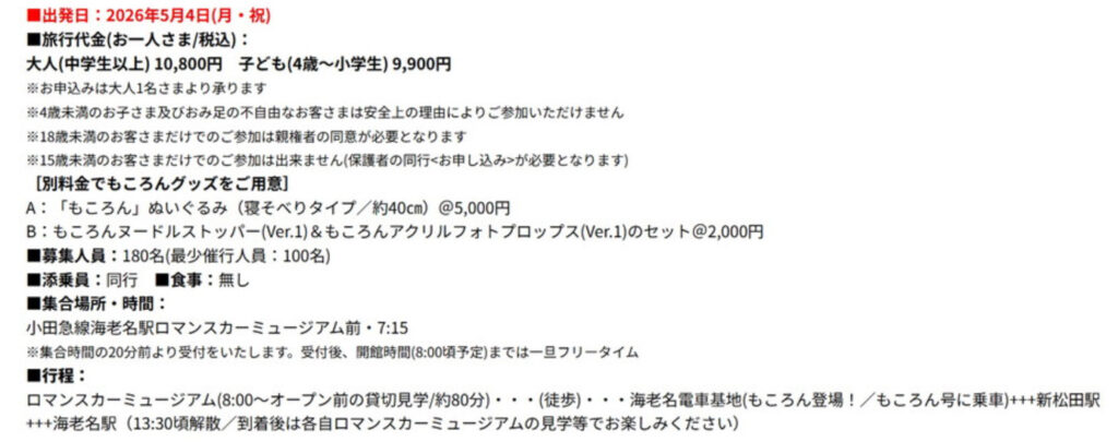 小田急電鉄は、2026年5月4日・5日に、貸切のロマンスカーミュージアム見学と、ラッピング電車「もころん号」の特別運行を組み合わせたツアーを開催します。参加者は開館前のミュージアムを特別見学後、海老名電車基地から乗車し、新松田駅を経由する特別ルートを走行します。車内や館内では限定イベントも実施され、当日は再入場も可能です。料金は大人1万800円(小学生9900円)で、記念グッズ付き。申し込みは「小田急まなたび」サイトで受け付けます。