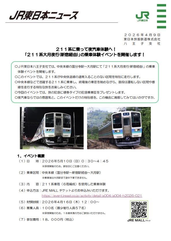 @funnymouth"211系に乗って夜汽車体験へ!「211系大月夜行(新宿経由)」の乗車体験イベントを開催します![PDF/263KB]" - jreast.co.jp/press/2026/hac… via "ニュースリリース|企業サイト:JR東日本" - jreast.co.jp/press/