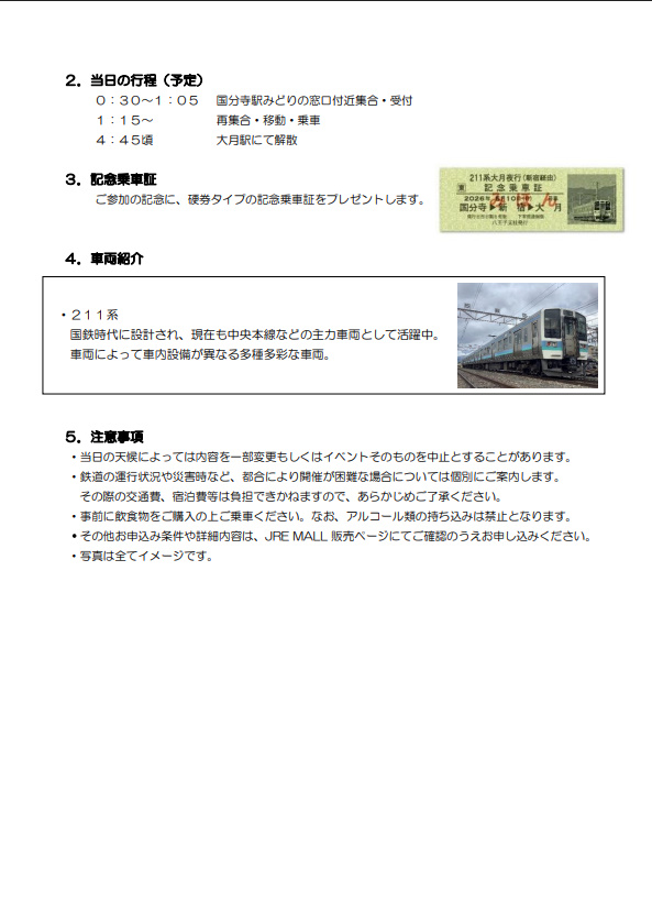 @mikanzukituyu02211系に乗って夜汽車体験へ!「211系大月夜行(新宿経由)」の乗車体験イベントを開催します![PDF/263KB] jreast.co.jp/press/2026/hac…