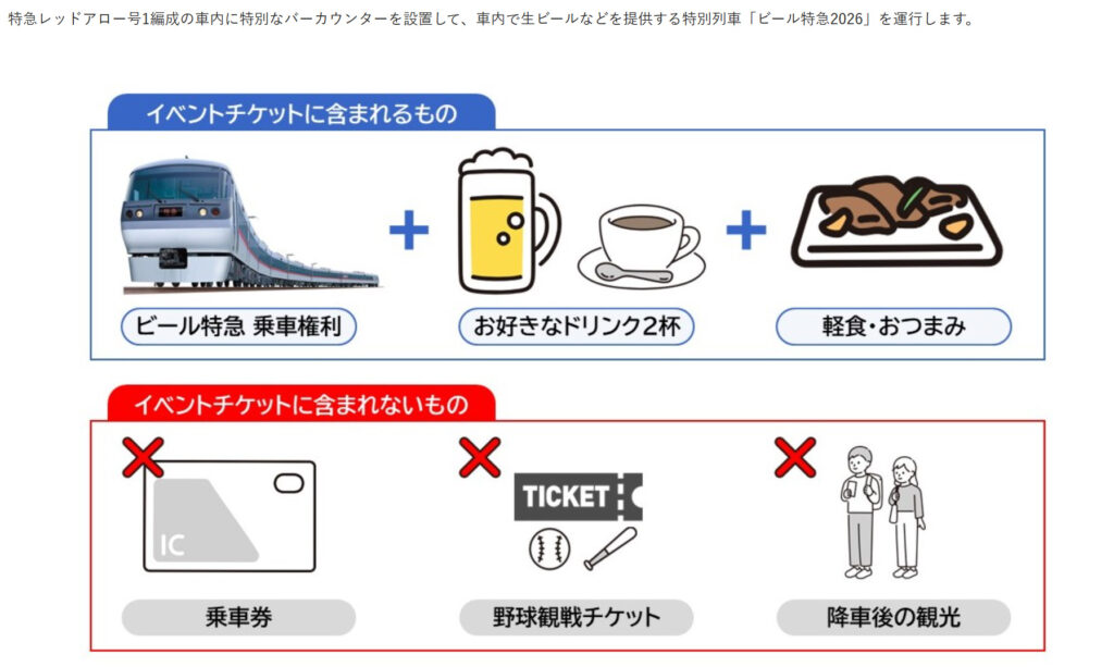 @Tokorozawa_news【レッドアロー『ビール特急2026』】 西武鉄道は特急レッドアロー号にバーカウンターを設置して、生ビールなどを提供する特別列車『ビール特急2026』の運行を発表しました!🍺 西武鉄道が展開するプロモーション「想像のナナメ上へ」のもと、新宿線沿線に本社がある居酒屋『一休』と連携した企画👀 pic.x.com/k2KqIzAkob