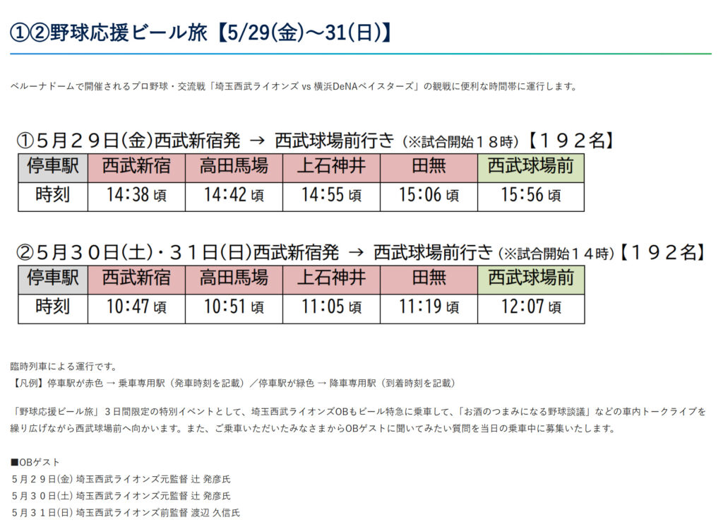 @TokyoBeerDiver5/29(金)~31(日)横浜DeNA戦で西武新宿駅発 特急レッドアロー号による「ビール特急2026」運行決定!/ライオンズ元、前監督による『お酒のつまみになる野球談議』トークも車内で開催! | 埼玉西武ライオンズ seibulions.jp/news/detail/20…