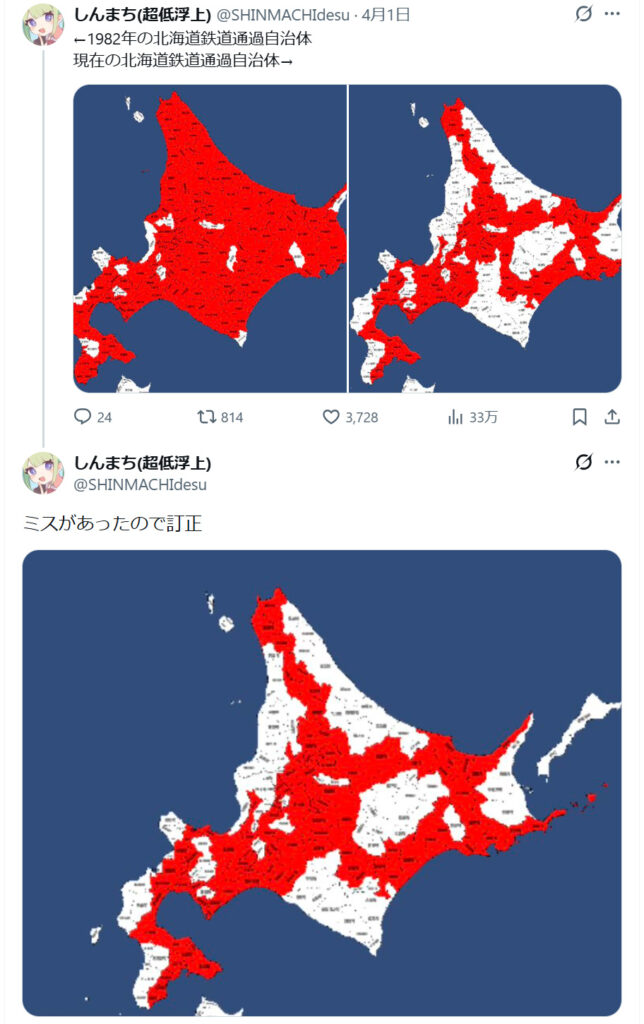 @hamattiy北海道の地図で、「鉄道が通っている自治体」に色を塗ったら…… 44年前と現在の差に「世知辛い時代だな」(ねとらぼ) news.yahoo.co.jp/articles/b49c9…