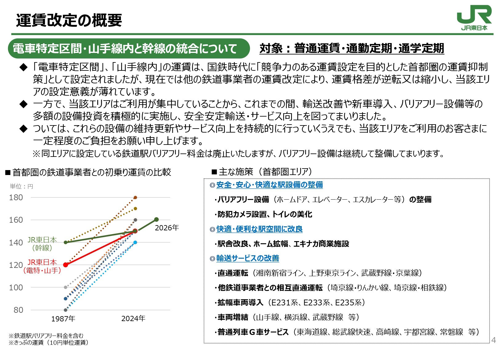 JR東日本は増収増益にもかかわらず運賃を値上げしましたが、その主因は通勤定期など定期旅客部門の採算が悪いことにあります。特に在来線の定期利用は割引率が高く、収入がコストを下回り赤字となっている可能性が高いのです。また、値上げは安全対策や設備更新、災害対応など将来投資のための安定財源確保を目的とし、利用者全体で公平に負担する狙いがあります。さらに、運賃は国の認可制度で厳しく制限されており、増収も必要最小限に抑えられています。加えて、国鉄時代の巨額債務の返済や税負担の観点からも、安定した利益確保が求められており、こうした事情から今回の運賃改定は妥当とされます。
