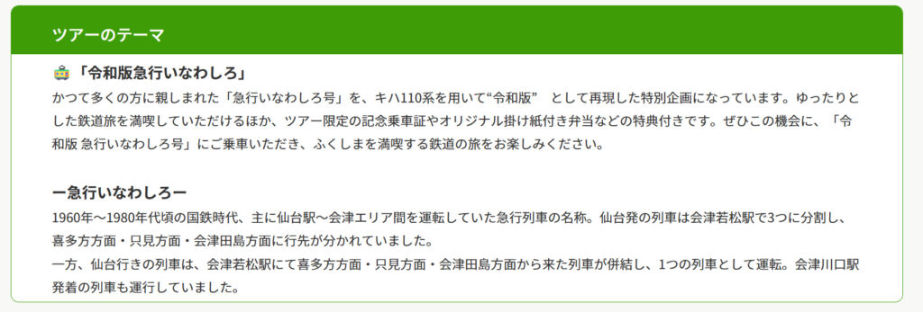 JR東日本は、ふくしまデスティネーションキャンペーンの特別企画として、かつて運行された急行「いなわしろ号」を再現した団体臨時列車を2026年6月に運行します。キハ110系を使用し、“令和版”として再現されます。ツアーは仙台発(只見線経由で会津若松まで約8時間半)と喜多方発(仙台まで約4時間)の2コースを設定され、弁当や記念乗車証などの特典付きで、旅行代金は9000~1万3000円です。申し込みは4月20日から受け付けます。