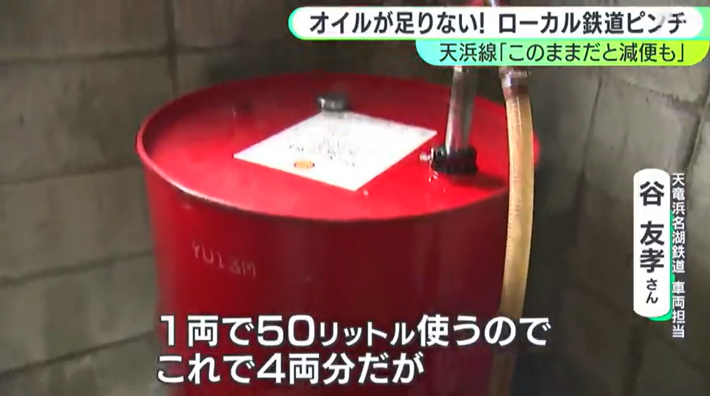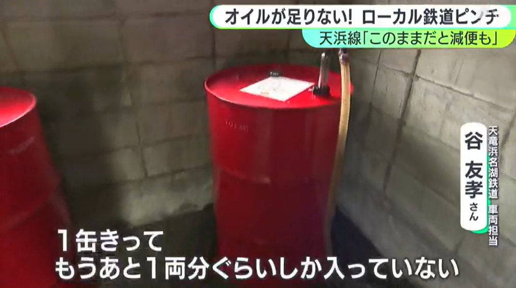 @jsh_9696「ドラム缶にはあと1両分しか入っていない」ディーゼル列車の“心臓”守るエンジンオイルが足りない 減便の可能性も… イラン情勢の影響がローカル鉄道にも(静岡放送(SBS)) #Yahooニュース news.yahoo.co.jp/articles/3889e…
